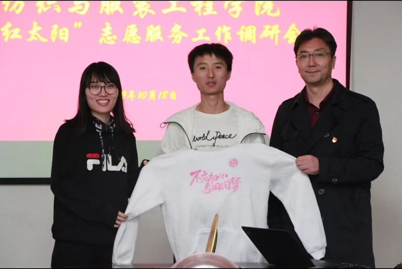 最后,董召勤代表学院党委向“红太阳”爱老志愿服务团团长赠予工作服,该工作服是由学院实验室与轻化教工党支部的党员们利用专业技能,自行设计与印制的,此举充分表达了教工党员对该志愿服务活动的支持,以及对老同志们的关心。