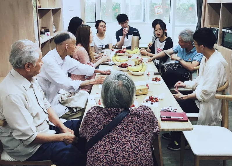参观完书院的硬件设施后,青年学生们邀请退休教师至书院餐厅稍作休息。茶水瓜果芳香间,大家进行了座谈交流。季彦斐简要介绍了近年来学院的发展情况,并询问关心了退休教师们的现状。陪同学生们分别汇报了自己的学习、工作、生活等各个方面的情况,与退休教师探讨问题、畅谈理想。退休教师们纷纷回忆起往昔岁月,都由衷地感到高兴与自豪,欣慰之情溢于言表。历史变迁、初心永存,是对老一辈丝绸人奋斗的最好诠释。