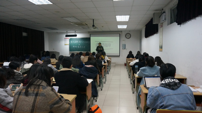 接下来,主持人邀请老师上台为大家展开更具体的说明。蒋老师先向同学们讲述了我院科研的开展情况和取得的成就,鼓励大家积极参加科研活动,对待科研不应该害怕,而应该勇于挑战自我。接着蒋老师又向大家说明了科研的好处。大的层次,他强调了科研对同学们未来学习就业,对同学们合作能力的培养,以及提升英语水平三个方面的益处。小的层次,他认为科研能让同学们掌握科学仪器的使用方法。随后蒋老师告诫同学们,做科研不能眼高手低,比如应从一个小问题开始着手而不是选择范围很大的课题。从自己感兴趣的方面和老师所给课题两个方面综合考虑,选择适合自己的和自己能做好的课题。随后又为同学们讲解了“怎么做”这个问题,他指出科研应该先提出构想,然后写出合理的策划,同时要广泛阅读国内外文献,最后运用数据分析,将图纸画出来。蒋老师细致的讲解使同学们有了清晰的思路。