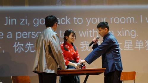 纺织与服装工程学院的参赛人员——陆家玮、令狐荣鑫、郑子轩、朱雨婷、贾庆良、余杰、邓栋阳和苏哲,为我们带来的是曹禺先生著名话剧——《原野》。充满仇恨的仇虎(陆家玮饰),勇敢地带上金子(令狐荣鑫饰)逃出了焦家,但难逃内心的自责,在黑暗中告诉金子“You must get on the train.You must go throuth the wilderness to the place where we dream of.(你必须上火车。你必须穿过荒野到我们梦想的地方。)”,最后将利刃刺进了自己的胸膛,留下金子一人在这空旷黑暗的原野上。泼辣狠毒的焦母(朱雨婷饰),命运多舛的金子以及懦弱善良的大星(郑子轩饰)。他们在舞台上为我们带来了这场复杂深刻的命运悲剧,将那个封建黑暗的年代展现在我们面前,为我们塑造了一个个有血有肉的人物形象。