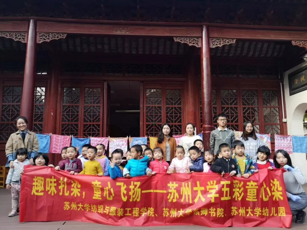 11月21日下午,在苏州大学幼儿园,来自苏州大学纺织与服装工程学院、苏州大学紫卿书院的老师和众多志愿者们,为幼儿园小朋友们带去了一堂生动有趣的扎染体验课。