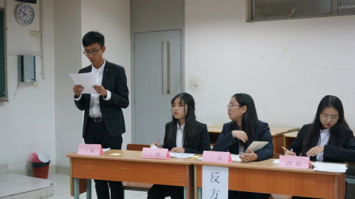 比赛开始前,比赛主席王雨梵介绍了此次辩论正反方。接着双方选手进行自我介绍。随后主席介绍比赛规则,并宣布此次辩论赛正式开始。本次比赛采用固定辩题,分为六个环节,分别是一辩陈词、驳论、二辩对辩、质询与质询小结、自由辩论、总结陈词。