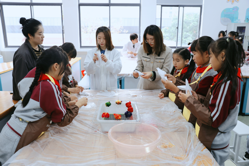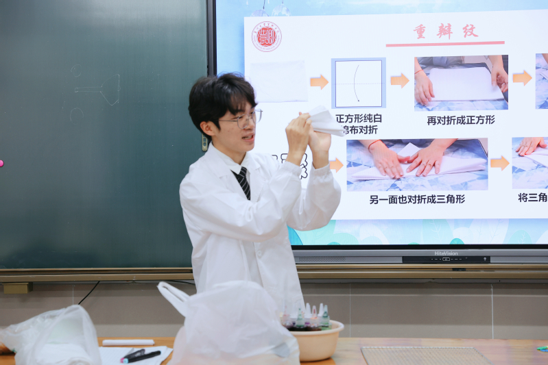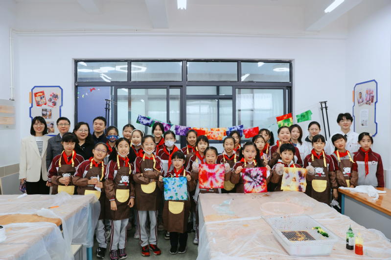 仪式结束后双方领导移步教室,观看孩子们的扎染学习与实践。学院“小实验,大文化”纺织科普实践团的三位志愿者带领星洲小学文创社团的孩子们走进非遗艺术——扎染。孩子们了解了扎染的历史、欣赏了扎染艺术作品,认识了扎染工具,学习并尝试了扎染方法。小学生们在知识讲授里、在动手操作中建立起了对纺织知识的兴趣、加深了对纺织文化的认识。同时,学院的志愿者们进一步践行知行合一,在劳动实践中检验专业学习成效,在志愿奉献中弘扬纺织文化,一起收获了累累硕果。
