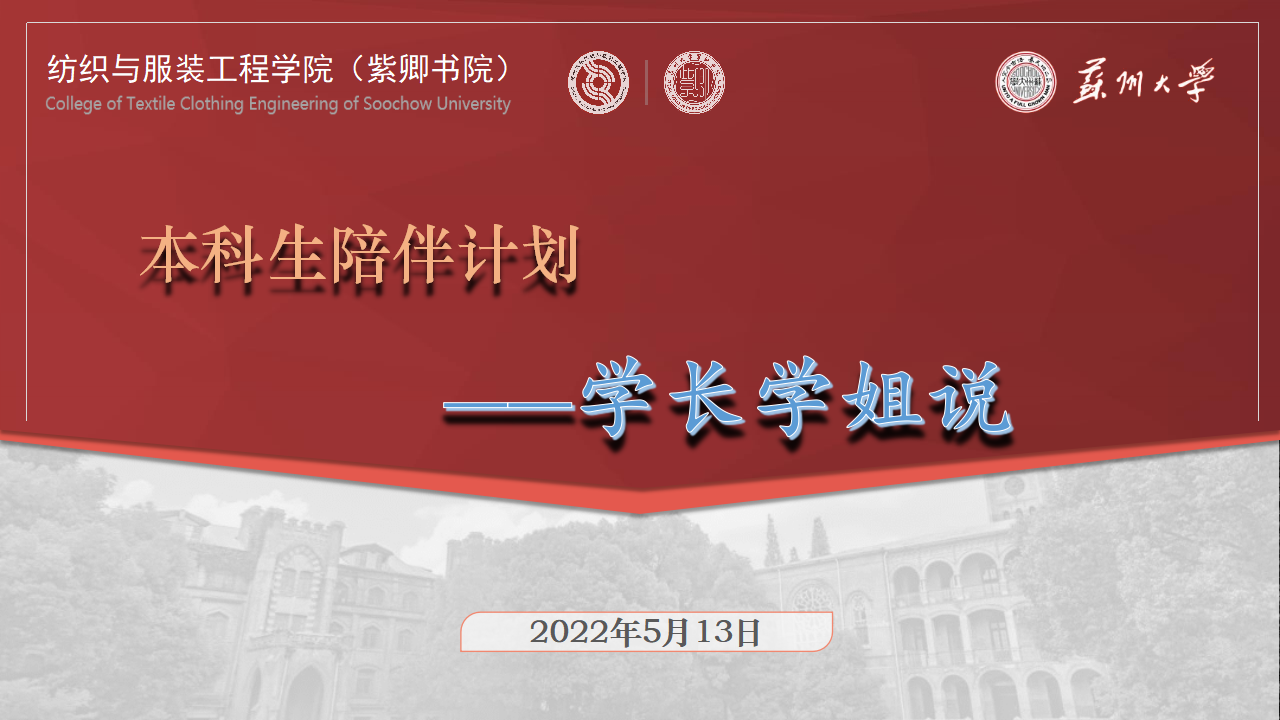 5月13日晚,纺织与服装工程学院(紫卿书院)本科生陪伴计划之“学长学姐说”活动在腾讯会议线上举行。活动邀请了优秀学生韩颖、吴玉婷、孟靖达、刘冉分享学习科研、创新创业、考研升学等方面的经验。纺织与服装工程学院党委副书记、副院长虞岚出席本次活动,2021级、2020级全体本科生、辅导员线上参与,分享会由辅导员杨洋主持。
