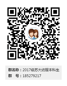 QQ群名称:2017级苏大纺服本科生 群 号:185279217