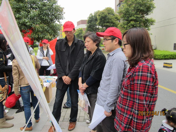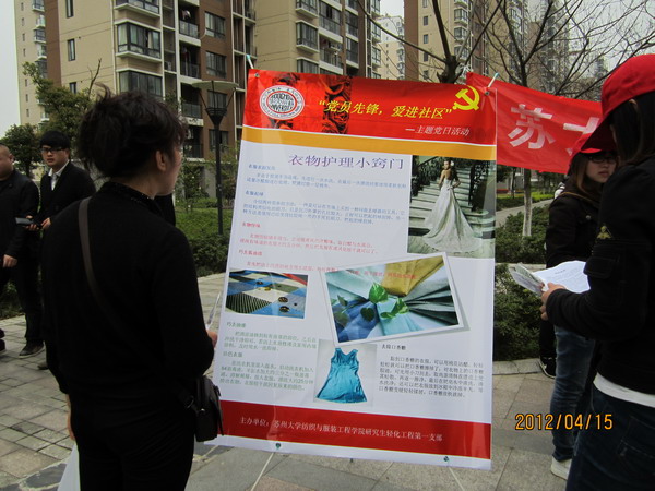 以学雷锋精神的继续深入为契机,进一步贯彻落实院党委关于深入开展“创先争优”活动的精神,纺织与服装工程学院研究生轻化工程第一支部在4月15日,本着发挥纺织专业优势,服务大众的原则,走进苏州工业园区翰林缘社区,组织开展了以“党员服务进社区”为主题的党日活动。