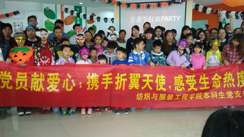 2015年10月31日,纺织与服装工程学院分党校的预备党员和入党积极分子们来到桂花社区蝴蝶妈妈活动室为培智儿童奉献爱心,陪他们欢度万圣节。