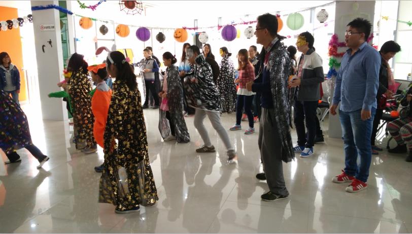 装扮结束之后,主持人放了一段万圣节动画视频,孩子们看得津津有味,并且在这其乐融融的氛围下,主持人宣布了万圣party正式开始。首先让孩子们提问,且提问的孩子会奖励糖果,此话一出,孩子们便争先恐后地举手提问,在场的主持人和志愿者们更是不厌其烦地为他们解答,这一环节都让大家大长知识。接下来是更为有趣的集体活动,老师现场教授大家跳兔子舞、水中只用嘴吃苹果比赛,比赛的结果早就不重要,重要的是在这一过程中,孩子们和我们志愿者之间能相互关爱,共同欢乐。