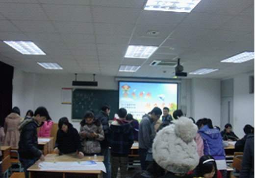 转眼间一个半小时过去了,到了展示作品的环节。各组代表手持各组作品欢喜地站上讲台,尽其所能展示自己组的作品。同学们的风筝各有特色,十组别具一格设计了圆柱形立体小天使,八组设计师们突发奇想设计了中空的风筝形式,四组是色彩斑斓的花蝴蝶,二组的“漫画大师”画了幽默可爱的卡通人物……漂亮的风筝让我眼花缭乱、目不暇接啊,同学们的想象力和创造力得到了充分的发挥,代表们和观众的互动带起了场下的一个又一个小高潮。其他作为评委的组也争先恐后发言帮助自己支持的队伍拉票,整个教室顿时成了欢乐的海洋,同学们脸上都洋溢着灿烂的笑容,享受着大家团结协作带来的成果,将活动拉入了新的高潮。