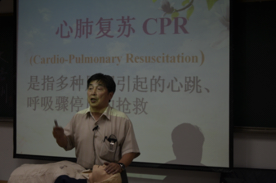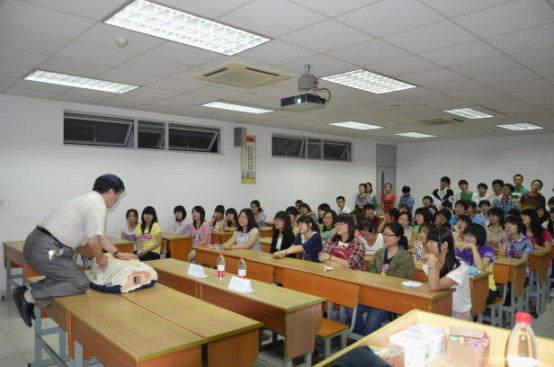 在一段触目惊心的《唐山大地震》电影片段的放映后,蒋玉林老师便拿出了他的道具——人体模型,开始了他绘声绘色、幽默风趣并且详细精彩的急救常识培训。蒋老师着重就心肺复苏技能进行了培训。首先蒋老师讲述了如何判断救助者属于需要心肺复苏患者,分为意识、呼吸、心跳三种判断方法。然后讲述了心肺复苏的两种类型:胸外心脏按压和人工呼吸。并具体讲述了救助过程中需要注意的问题和经常出现的错误,以免对患者造成二次伤害。接着蒋老师讲述了对婴儿,儿童和成人三类不同类型的人进行救助时的异同点。在培训过程中,蒋老师一边语言描述,一边在人体模具上进行示范操作,同学们也听得津津有味,还不时比划学习着。最后,蒋老师还特地留出了部分时间供同学们在人体模型上实体操作,并在一旁耐心、细心地指导。