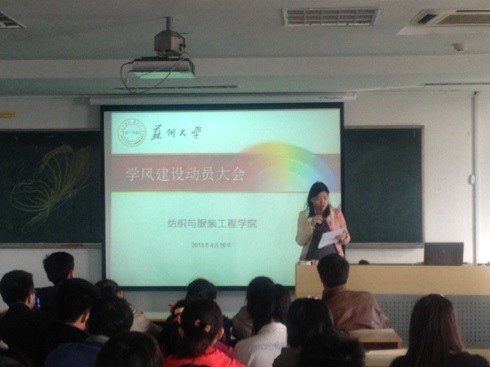 接下来,马老师公布了我院2012年优良学风班级评比结果,10-轻化班和11-纺织国际班获得了此项光荣称号。马老师向同学们详细介绍了评比细则。评比主要分为三个部分:班级的申报及自评,任课老师对班级的评价以及班级的ppt展示。在这次的优良学风班级评比中,每个班级都展现出他们各自的风采。马老师也希望,通过优良学风班级评比,纺织与服装工程学院也能更进一步,更上一层楼。