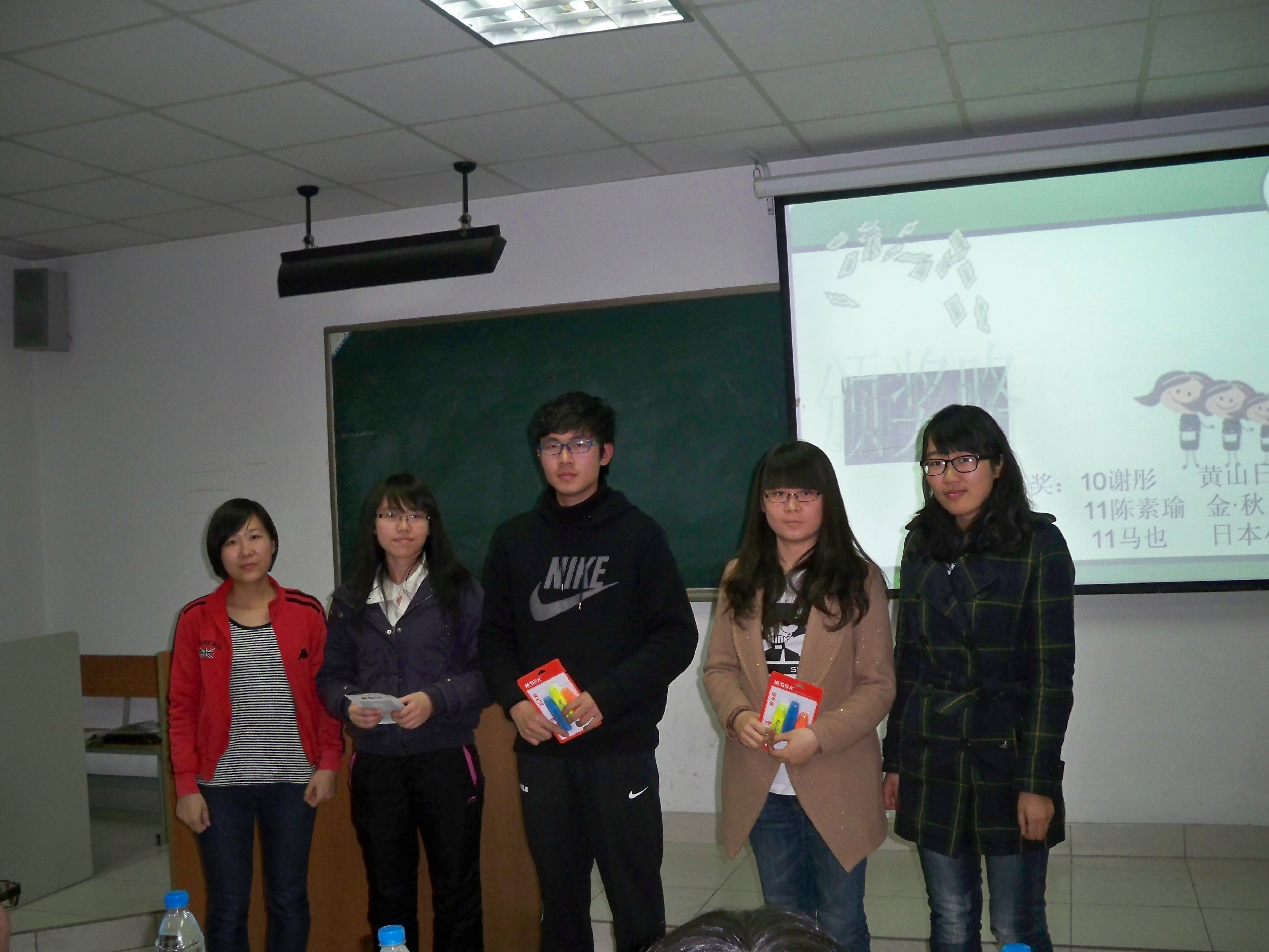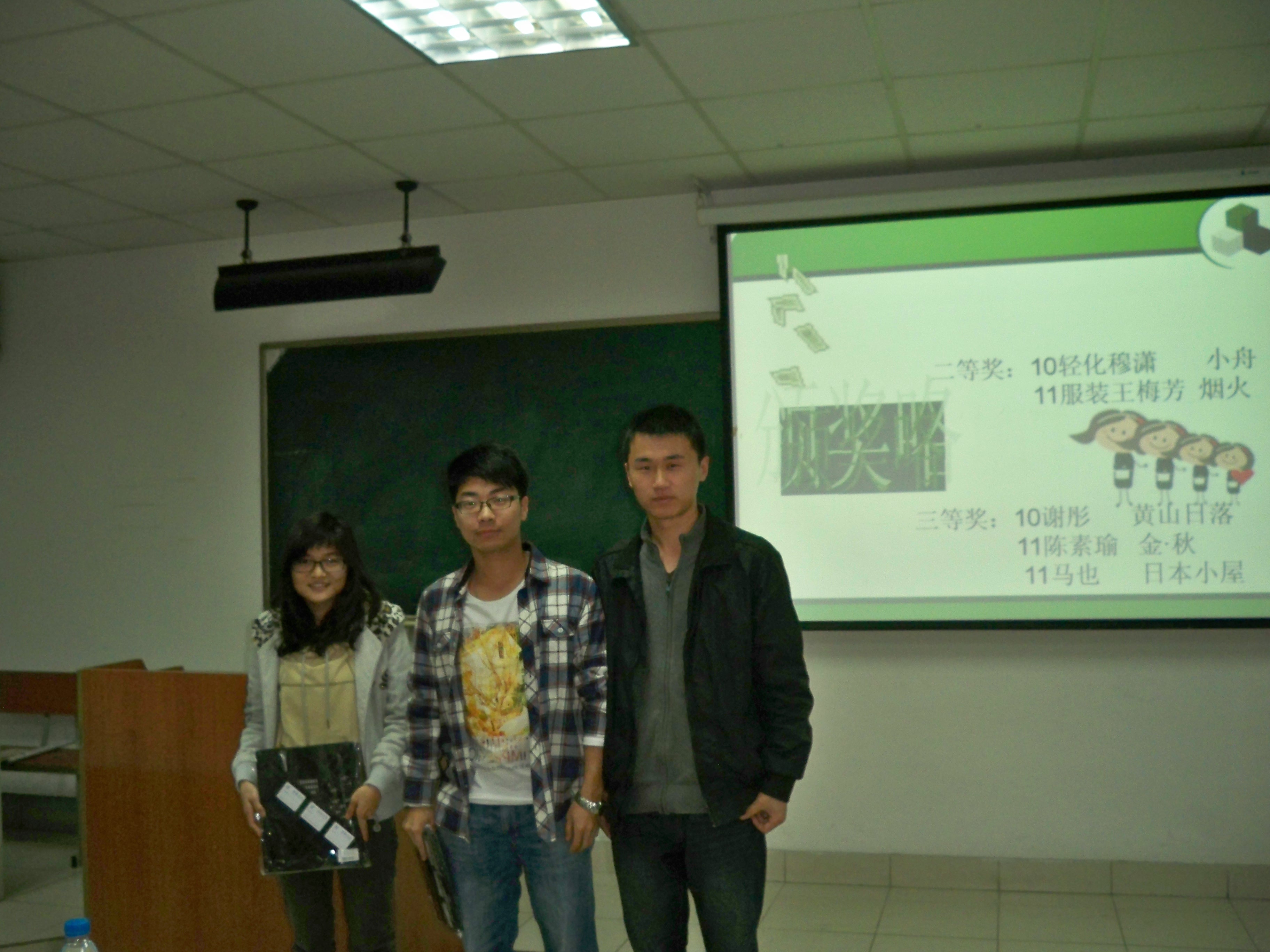 本次大赛的桂冠由11纺织刘天尧同学摘得,而二等奖由10轻化穆潇及11服装王梅芳同学获得,11纺国马也同学、10服装谢彤同学、11轻化陈素瑜同学共同获得三等奖。最终,晚会现场,颁奖嘉宾蒋孝峰老师、《击水》主编张国强、编辑主编李文莹、行政主编周丹同学为获奖作品作者隆重颁发奖品并合影留念。