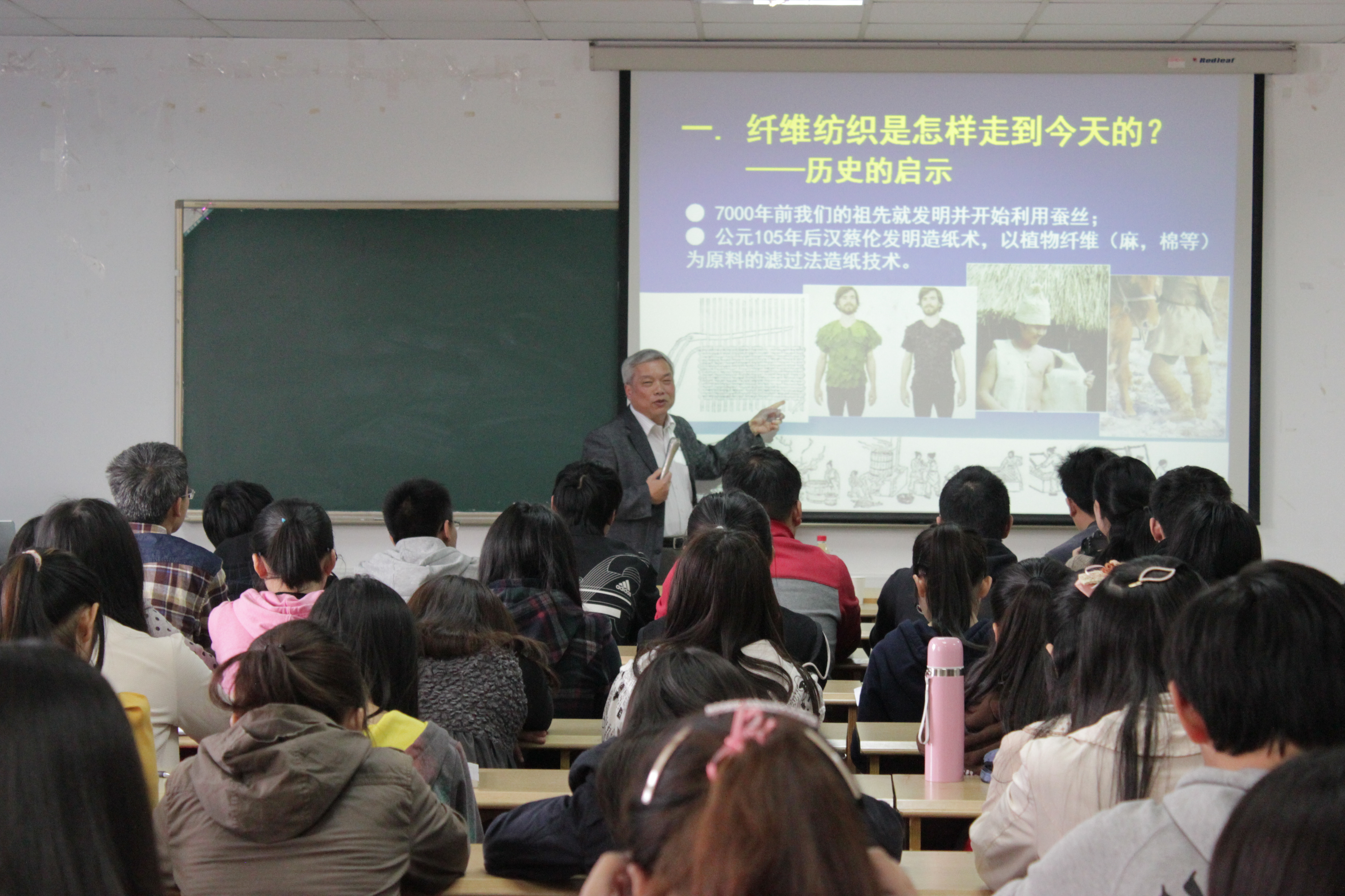 4月23日下午3:30,工科楼222教室座无虚席,纺织与服装工程学院特邀纺织工程专业退休教师白伦教授为2013级新生举办达生大讲堂之职业生涯规划讲座,本次讲座的主题是“今日纺织科学谈”。讲座由学院纺织工程系主任陈廷教授主持,学院党委副书记、副院长潘爱华及团委副书记马书明一起参加了讲座。