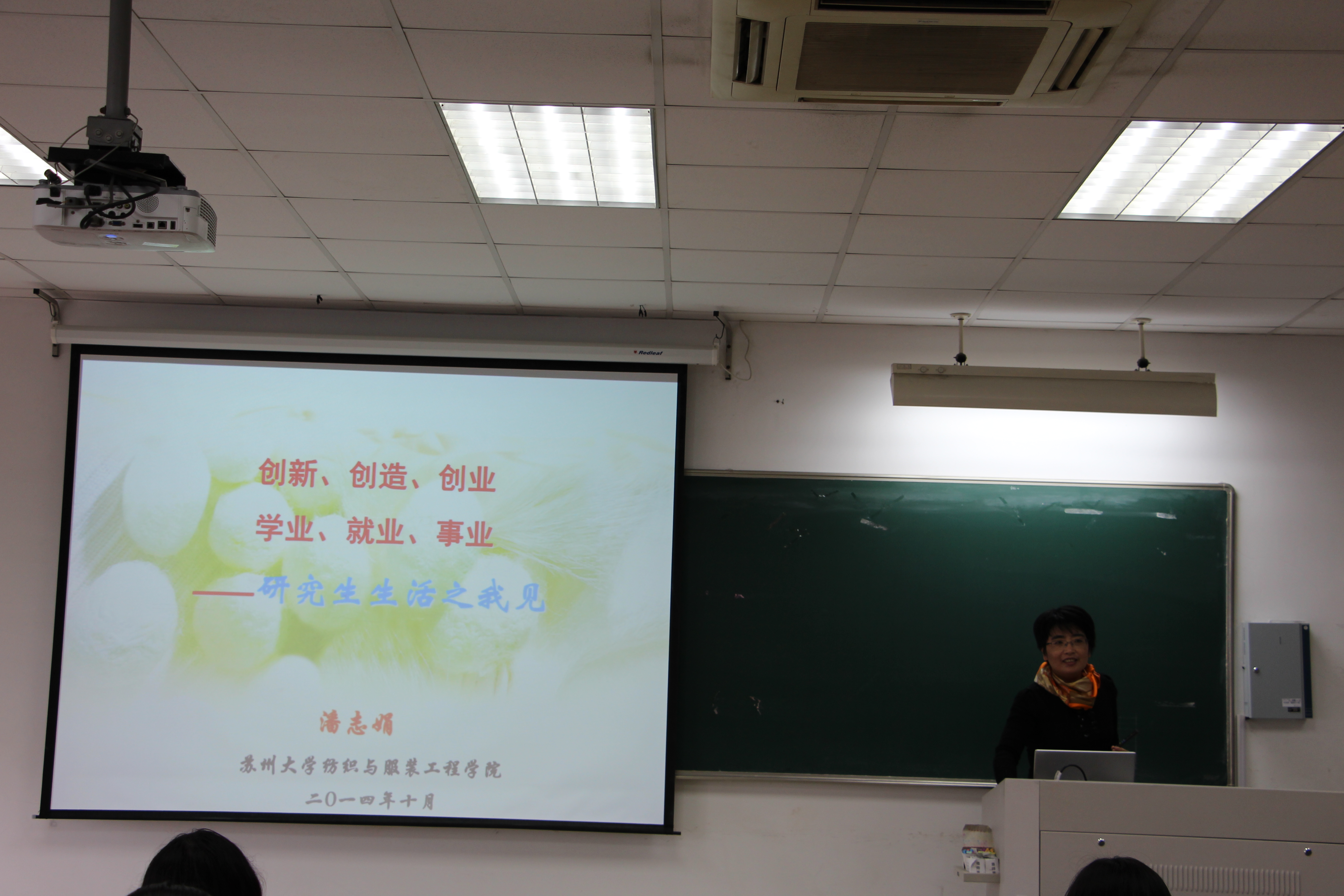 2014年10月30日上午九点半,在独墅湖302幢2503教室里,苏州大学纺织与服装工程学院副院长、博导潘志娟教授面向全体纺院2014级研究生新生进行了一场名为“创新、创造、创业 学业、就业、事业——研究生生活之我见”的别开生面的新生入学教育。潘院长结合往届优秀硕士生生动的事例向新生们介绍了研究生学习及其特点,指出他们已经进入了一个新的人生、学习阶段。她幽默、全面、实际的话语赢得同学们的热烈掌声,大家都受益匪浅。