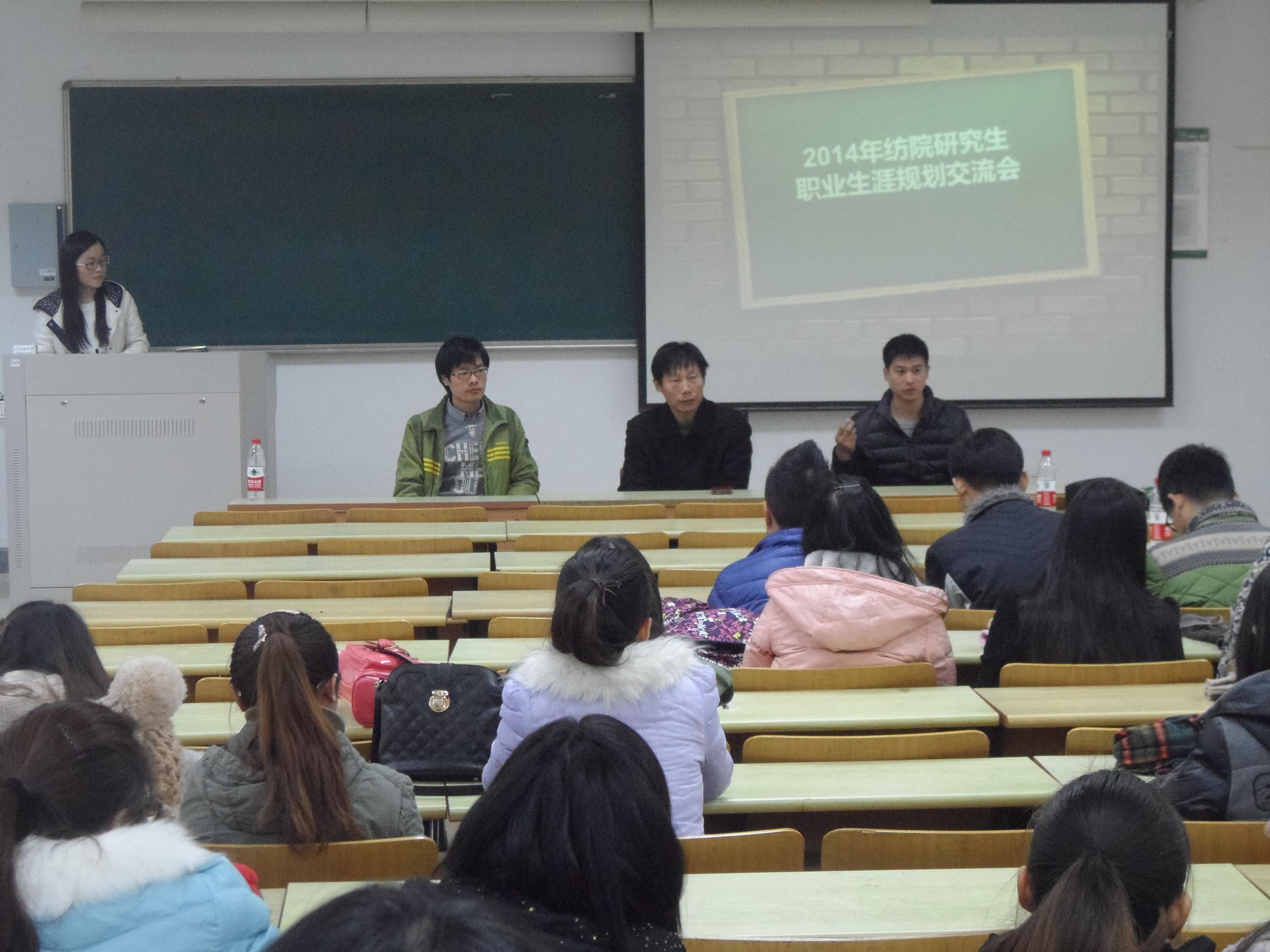 2014年12月14日,由纺织与服装工程学院研究生会主办的研究生职业生涯规划交流会在独墅湖校区301#1109举行,并得到很好的效果。参加该交流会的有江苏工程职业技术学院的老师马新成;苏大研究生毕业,现任职苏州楚星时尚纺织集团有限公司的李帅师兄;潘志娟老师的在读博士王哲师兄以及全体14级纺院的研究生。他们主要介绍了一下各自对于学习和生活的一些感悟。这次经验交流会的目的是让研一新生更快的进入研究生的学习生活之中,少一些迷茫,疑惑。