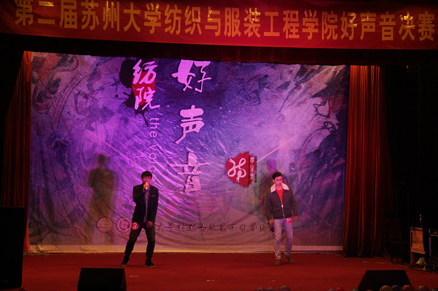 2017年3月19日晚6点,由苏州大学纺织与服装工程学院团委主办,纺院学生会承办的第二届纺院好声音歌手比赛决赛于本部敬贤堂正式拉开帷幕。本次到场的嘉宾及评委有党委副书记、副院长潘爱华老师,勤工办季彦斐老师,团委书记刘海老师,团委老师赵伟,纺院总实验室魏老师,2014年中国好声音江苏省南方区亚军、苏州市开星艺术培训中心老师韩其强,音乐爱好者社团社长、音乐学院学生会社团部部长陈晓东以及纺院学生会主席李梓润。学习部葛灿和丝韵文娱曹雪纯担任此次比赛的主持人。