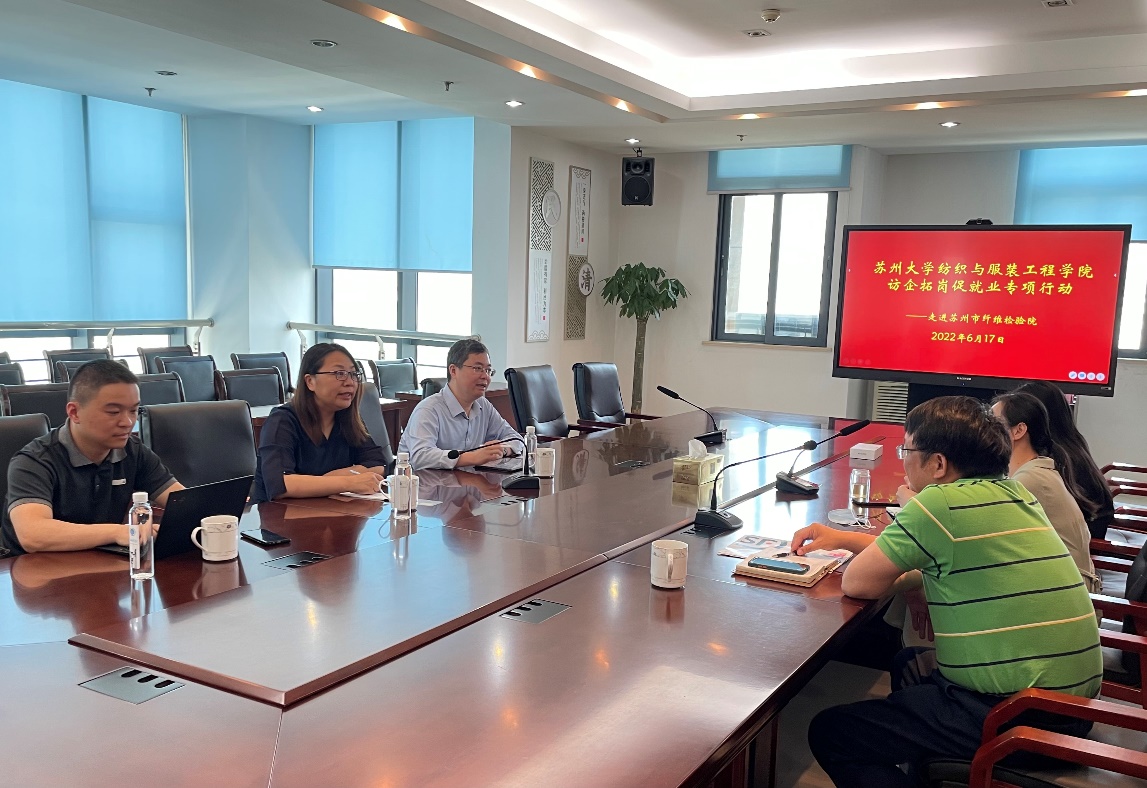 6月17日,学院党委书记肖甫青、副院长关晋平率队走访苏州市纤维检验院。苏州市纤维检验院副院长朱兰、郭建峰就人才招聘计划、工资待遇、高层次人才引进计划和职位晋升通道等工作作了详尽介绍。双方就党建、人才培养、学生就业、CNAS实验室认证等工作达成广泛共识。