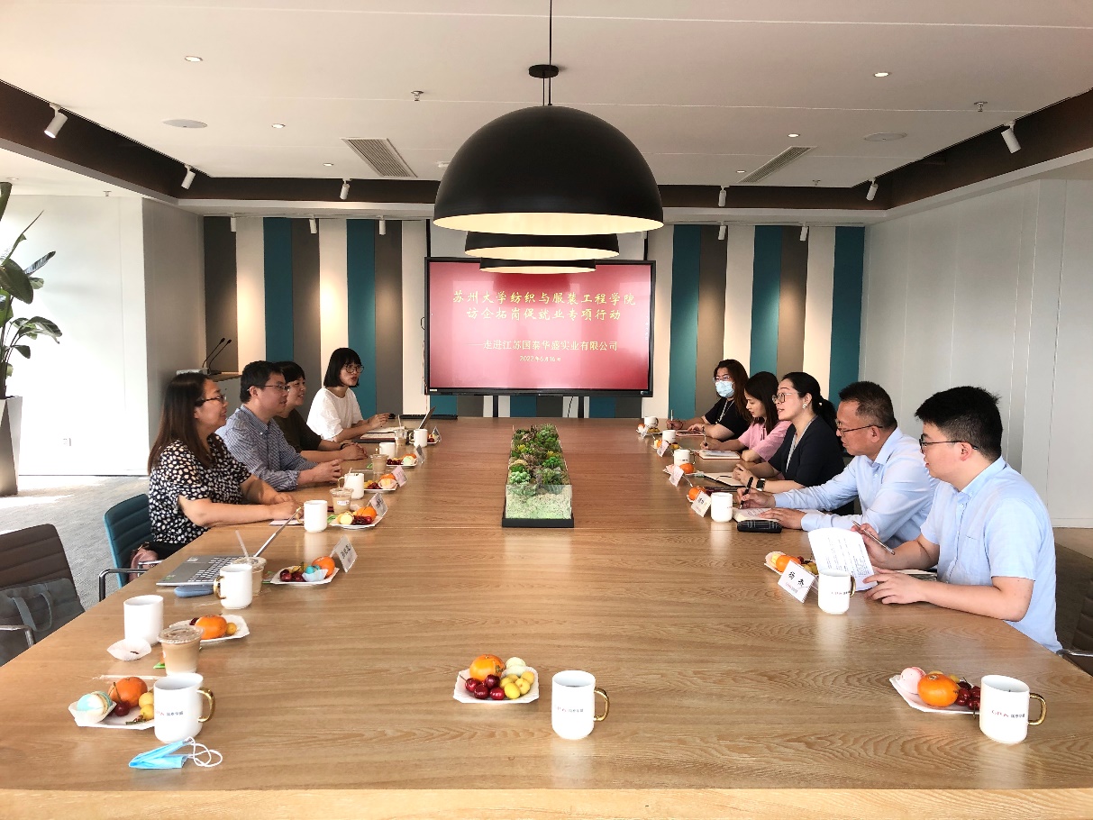 6月16日,学院党委书记肖甫青、副院长关晋平、副书记、副院长虞岚率队走访江苏国泰华盛实业有限公司。肖甫青介绍了学院人才培养和毕业生就业情况,双方就搭建双向交流机制、创新人才培养模式、强化校企协同育人、学生实习实训、新生入学教育、行业认知教育、促进毕业生就业等议题进行了富有成效的探讨并达成多个合作项目。江苏国泰国际集团股份有限公司副总裁、江苏国泰华盛实业有限公司总经理朱荣华表示企业正处于高速发展的上升时期,非常欢迎苏州大学的学生来公司实习、就业,将一如既往支持纺织与服装学院人才培养和大学生就业工作。活动开展期间,学院副教授洪岩还为企业开展了《可持续发展背景下服装行业的变革与创新》专题讲座。