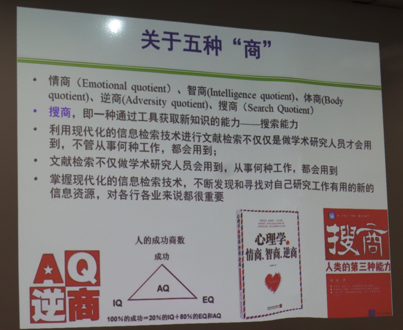 首先,李刚老师结合各方面的事例,介绍了文献检索的重要性和必要性。他指出,正如情商、智商一样,搜商也是一种能力,一种利用工具获取新知识的能力,而这种能力不仅仅是研究人员才需要拥有的,每个人不论是学习、生活还是工作,都需要这种能力。因此,掌握现代化的信息检索技术,不断发现和寻找对自己研究工作有用的新的信息资源,对每个人来说都很重要。此外,李刚老师也将检索的目的,从何处检索以及检索的结果评价进行了大致的介绍。