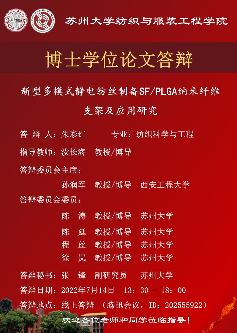 纺织与服装工程学院胡绮、朱彩虹博士论文答辩公告