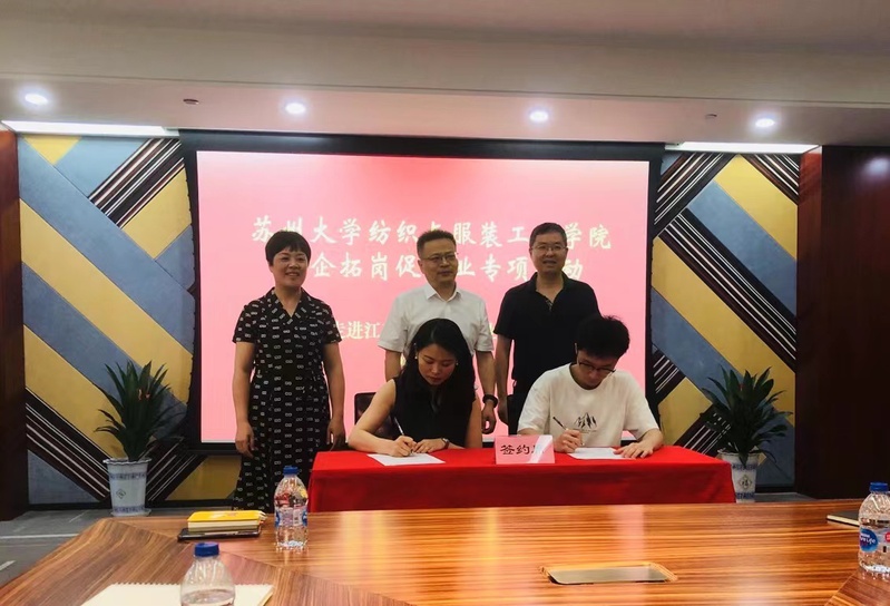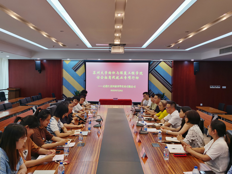 7月8日下午,纺织与服装工程学院党委书记肖甫青、党委副书记副院长虞岚、学生工作办公室主任季彦斐一行前往江苏国泰国华实业有限公司开展访企拓岗活动,江苏国泰国际集团股份有限公司联席总裁、江苏国泰国华实业有限公司董事长张斌,江苏国泰国华实业有限公司总经理孙凌,副总经理董晓梅、曾煜宏,总经理助理施豪、倪玉芬等领导热情接待肖甫青一行,在双方的见证下,15位本科毕业生完成就业签约。