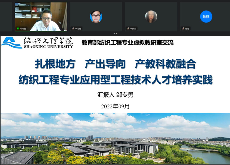 会议第一阶段进行了专业建设研讨。陈廷教授介绍了此次研讨内容以及主题发言学校绍兴文理学院在应用型人才培养方面取得的突出成绩。随后,邹专勇教授以“扎根地方 产出导向 产教科教融合”为题详细分享了绍兴文理学院在纺织工程专业应用型工程技术人才培养方面的经验。
