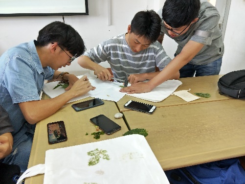 所有题目都完成后,团支书为同学们介绍了即将进行的小实验——拓染,并提醒同学们应选用色彩鲜艳,叶面鲜嫩柔软的植物材料。因为敲拓染实验需要将植物的汁液敲出染在布料上,干硬的枝叶所含的汁液少且难以榨出。