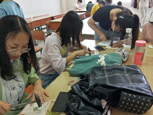 随后团支书建议大家自行在校园里寻找更理想材料,因为准备的材料不知道是否符合同学们艺术的追求。发放了实验所需的小石块和布料之后,大家互相交流探索实验的做法,开始拓染自己喜欢的植物材料,教室里此起彼伏的敲击声里都是大家认真的脸庞。从叶子的外轮廓到叶脉,他们细细地敲击着,这些都是他们的艺术品。渐渐地有同学停下来凝视他们的作品,旋即露出微笑,教室里的敲拓声逐渐减小,同学之间的声音便大了起来,教室里又热闹了一会。