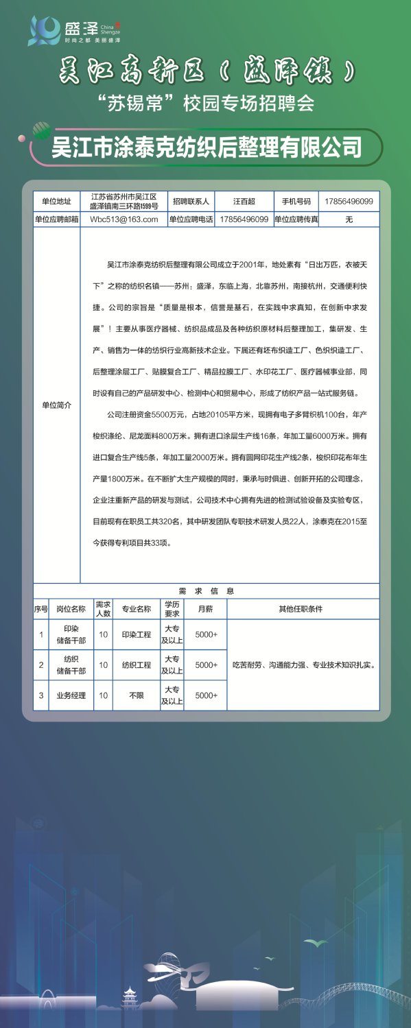 【招聘信息】吴江市涂泰克纺织后整理有限公司