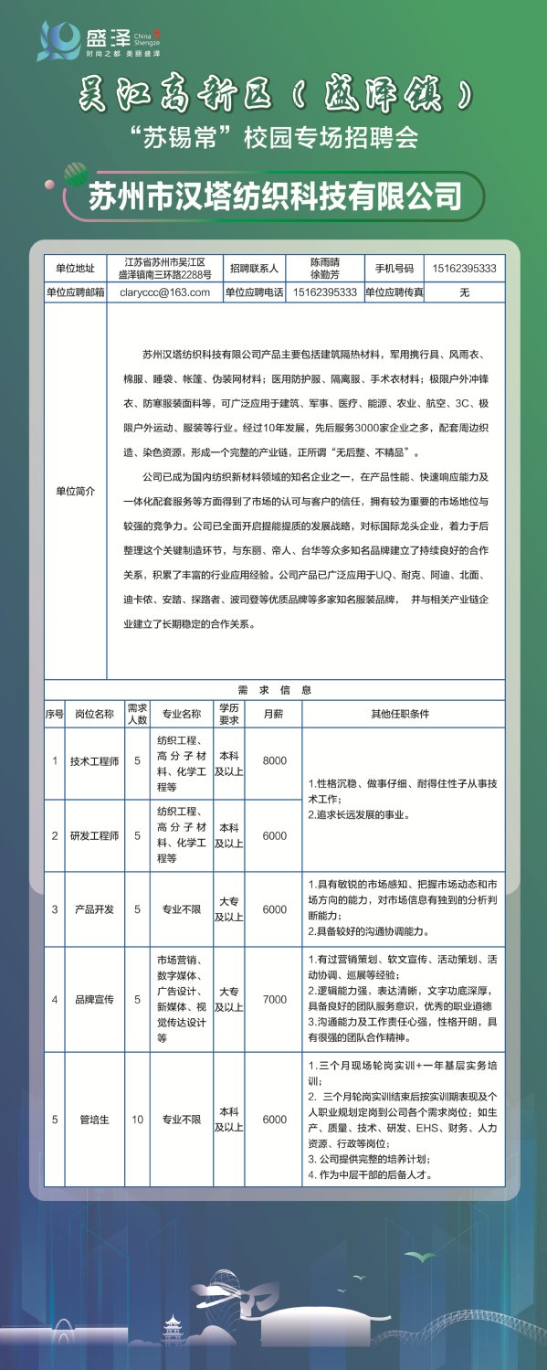 【招聘信息】苏州市汉塔纺织科技有限公司