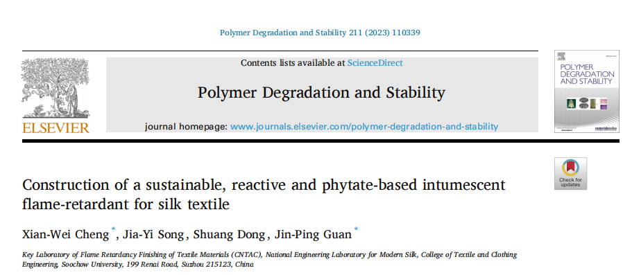 2023年4月,纺织行业纺织材料阻燃整理重点实验室关晋平教授团队在Polymer Degradation and Stability期刊发表了一篇题为“Construction of a sustainable, reactive and phytate-based intumescent flame-retardant for silk textile”(Polymer Degradation and Stability 211 (2023) 110339)的文章,第一作者为程献伟副教授,通讯作者为关晋平教授。