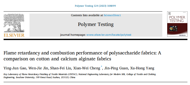 2023年6月,纺织行业纺织材料阻燃整理重点实验室关晋平教授团队在Polymer Testing期刊发表了一篇题为“Flame retardancy and combustion performance of polysaccharide fabrics: A comparison on cotton and calcium alginate fabrics”(Polymer Testing 124 (2023) 108099)的文章,第一作者为高颖俊讲师,通讯作者为程献伟副教授。