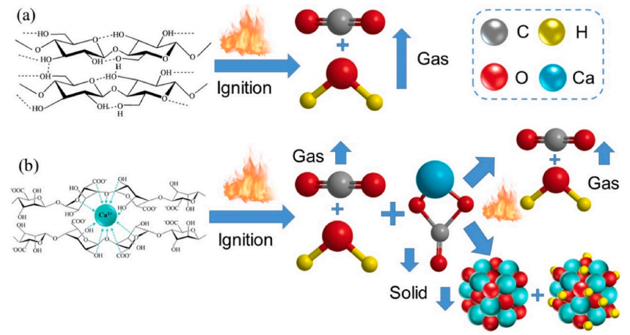 棉花和海藻酸钙(CA)纤维都是多糖纤维,但它们拥有不同的阻燃性能。对多糖织物的阻燃性和燃烧行为的详细比较对研究多糖纤维阻燃性能及阻燃改性具有较重要的意义。在本研究中,通过垂直燃烧、热重分析、傅里叶变换红外光谱仪(FTIR)和扫描电子显微镜,对这两种纤维制成的织物在燃烧过程中的差异、热解产物和炭残留物的形态和化学结构进行了研究。与棉织物相比,CA织物在垂直燃烧时没有余焰,且阴燃时间较长。特别是烟雾释放率、峰值放热率和总放热率都比棉织物低得多,说明CA织物的火灾危险性比棉织物低得多。热重分析与FTIR(TG-FTIR)的结果表明,CA织物表现出与棉织物不同的热降解途径。在相同的质量下,CA织物燃烧后产生更多的炭渣,并在炭渣表面生成菊花状的氧化钙作为保护屏障,导致CA织物的阻燃性能增强。