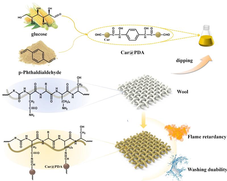 The development of halogen- and phosphorus-free flame-retardant strategies is urgently needed in textile industry. In this study, a caramel product doped with aromatic compounds was developed via caramelization and aldol reactions using glucose and p-phthaldialdehyde. The modified caramel (Car@PDA) was subsequently used as a sustainable approach to improve flame retardancy of wool fabric. The flame retardancy, washing durability, heat generation, and flame-retardant mode of action of Car@PDA on wool fabric were investigated. The modified wool fabrics showed excellent flame retardancy, with the limiting oxygen index increasing to 32.5% and the damaged length decreasing to 10.1 cm, with good self-extinguishing capacity. Car@PDA could combine with wool fibers through Schiff base reaction and electrostatic attraction, so the modified wool fabrics still self-extinguished and met the B1 flame-retardant requirements after 10 washing cycles. The modified wool showed significantly decreased heat release capacity and fire growth rate, suggesting high fire safety. Car@PDA promoted the decomposition of the fabric to form char barrier, thereby achieving an effective flame-retardant effect. In addition, the Car@PDA modification had a minimal effect on the tensile strength and handle of wool fabric. This study provides an innovative way to create bio-based, halogen- and phosphorus-free flame-retardants for protein wool fabrics.