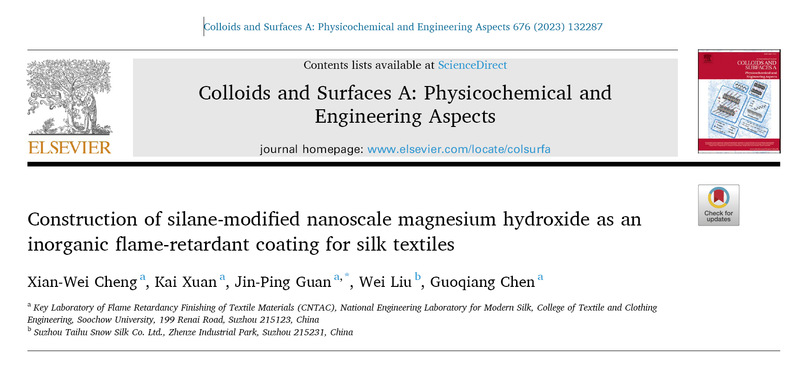 2023年8月,纺织行业纺织材料阻燃整理重点实验室关晋平教授团队在Colloids and Surfaces A: Physicochemical and Engineering Aspects期刊发表了一篇题为“Construction of silane-modified nanoscale magnesium hydroxide as an inorganic flame-retardant coating for silk textiles”(Colloids and Surfaces A: Physicochemical and Engineering Aspects, 2023, 676: 132287)的文章,第一作者为程献伟副教授,通讯作者为关晋平教授。