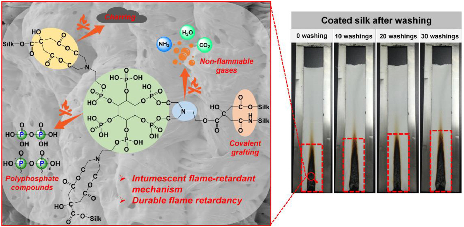 本研究采用生物质植酸、柠檬酸和三乙醇胺通过酯化反应合成了一种新型的反应性磷/氮协效阻燃剂。该阻燃剂可通过共价键与蚕丝织物交联,赋予蚕丝织物高效耐久的阻燃功能。该阻燃剂主要通过膨胀阻燃机理提高蚕丝织物的阻燃性能。改性蚕丝织物的热释放和总烟雾量明显降低,火灾安全性提高。改性蚕丝织物在垂直燃烧测试中自熄,极限氧指数达到32%,经30次洗涤后仍达到GB 8624-2012《建筑材料及制品燃烧性能分级》的B1级。