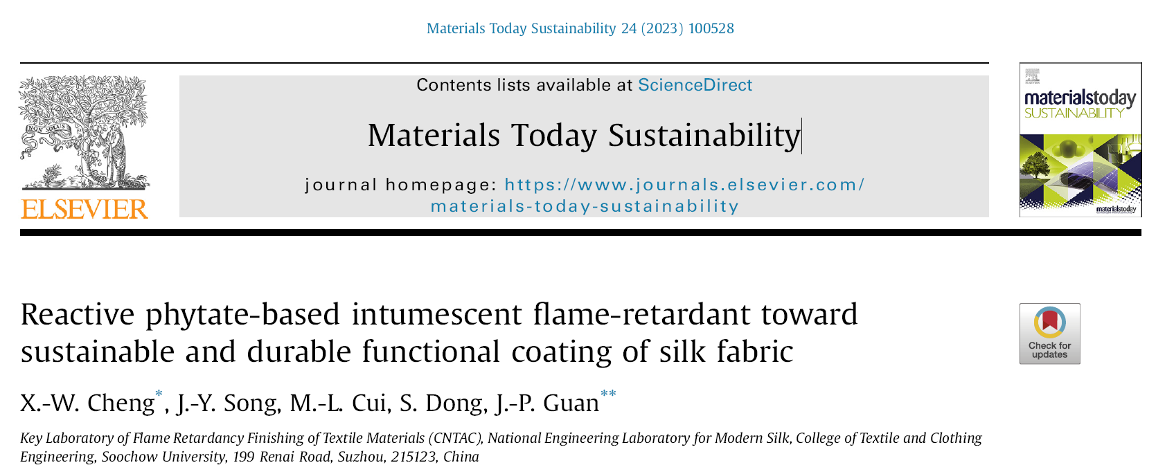 2023年9月,纺织行业纺织材料阻燃整理重点实验室关晋平教授团队在Materials Today Sustainability期刊发表了一篇题为“Reactive phytate-based intumescent flame-retardant toward sustainable and durable functional coating of silk fabric”(Materials Today Sustainability 24 (2023) 100528)的文章,第一作者为程献伟副教授,通讯作者为关晋平教授。
