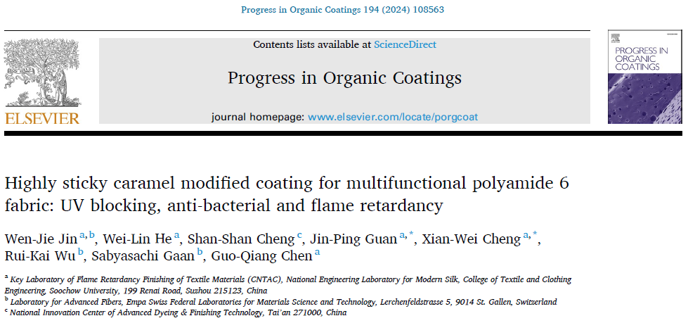 2024年5月,纺织行业纺织材料阻燃整理重点实验室关晋平教授团队在Progress in Organic Coatings期刊发表了一篇题为“Highly sticky caramel modified coating for multifunctional polyamide 6 fabric: UV blocking, anti-bacterial and flame retardancy” (Progress in Organic Coatings, 2024, 194: 108563)的文章,第一作者为金文杰博士,通讯作者为程献伟副教授和关晋平教授。