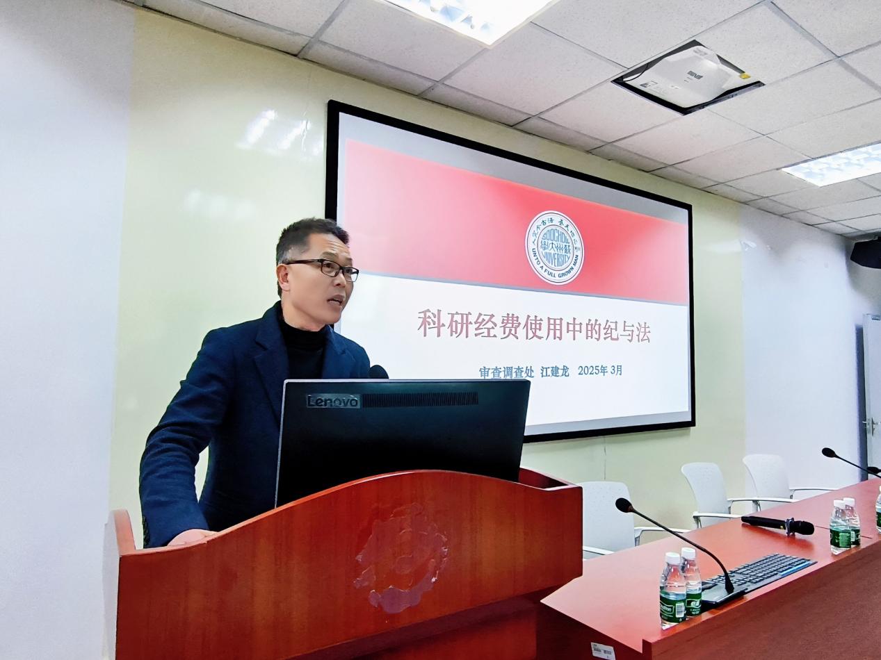 江建龙以《科研经费使用中的纪与法》为题,深入剖析了三个具有典型性的违法违纪案例。在讲解过程中,他对相关纪律规定与法律法规进行了详细解读,深入浅出地阐明了科研经费使用过程中潜在的风险点。最后,江建龙针对科研经费的规范管理,提出了切实可行的建议,明确界定了科研经费使用过程中坚决不可触碰的红线。他着重强调了两点关键内容:第一,纪律红线坚决不可逾越。科研人员必须时刻严守党的纪律底线,牢固树立廉洁自律意识,坚决杜绝利用职务之便谋取个人私利的行为;第二,法治理念要深入人心。科研人员应积极树立法治思维,自觉尊崇并严格遵守国家法律法规,对法律怀有敬畏之心,确保科研经费的使用全程依法依规进行。