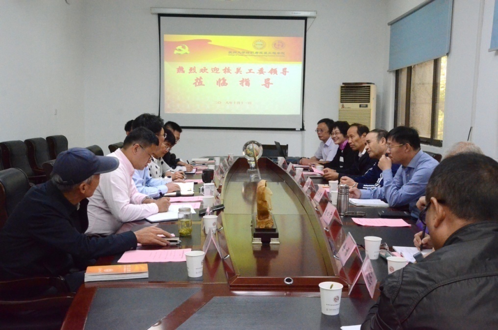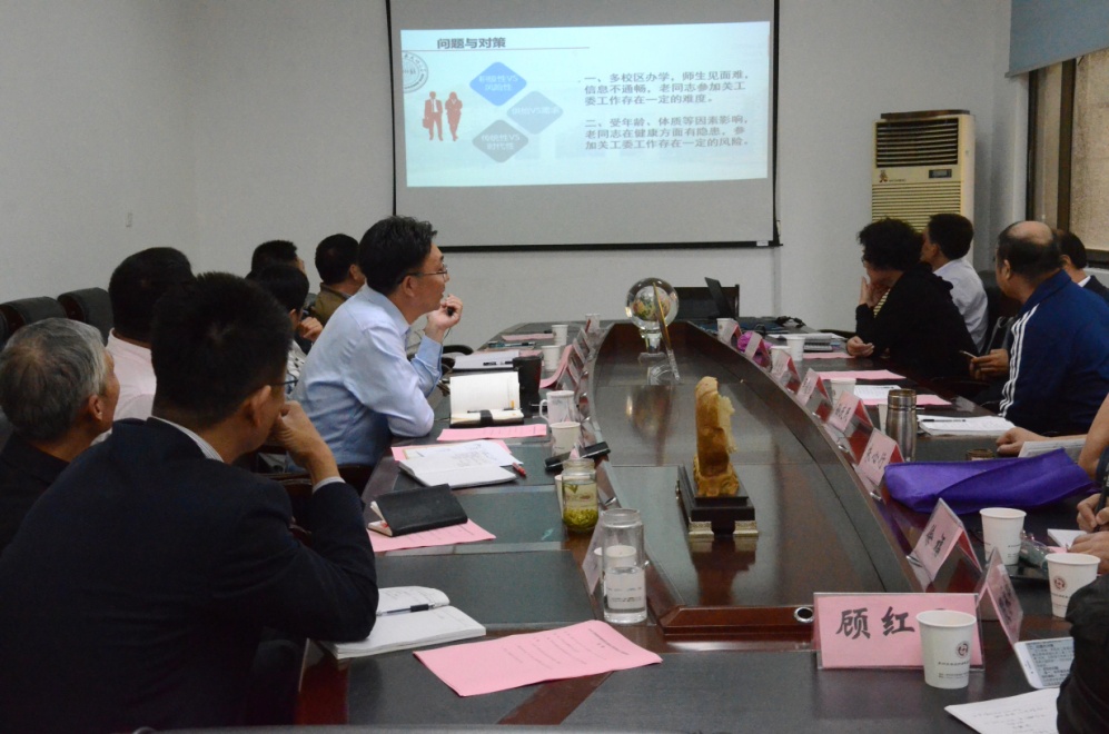 2018年10月11日,校关工委副主任吴俊生一行来我院考察调研我院二级关工委相关工作。校关工委委员、秘书长朱心行,校学生工作部(处)部(处)长、校关工委委员、秘书长孙庆民,校离退休工作部(处)部(处)长、关工委委员余宏明,校关工委副秘书长徐福、陈亦红,校学生工作部(处)副部(处)长、关工委副秘书长段永锋,校离退休工作部(处)副部(处)长、关工委副秘书长陈向民,校离退休工作部(处)综合科主任科员顾红卫等领导老师随同调研;学院院长、关工委主任潘志娟,院工会主席、关工委副主任周正华,院退休教工党支部书记、关工委副主任黄水慕,院退休教师协会分会会长、关工委副主任彭文彬,院党委副书记、副院长、关工委副主任、关工委办公室主任卢永嘉,院团委书记、关工委办公室副主任刘海及本科生专职辅导员孙晓旭出席本次调研会。会议由学院党委书记、关工委主任董召勤主持。
