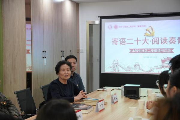 为进一步贯彻落实党的二十大精神,推动党的二十大精神和学习贯彻习近平新时代中国特色社会主义思想主题教育深入青年,在第28个“世界读书日”到来之际,纺织与 服装工程学院(紫卿书院)本科生社区二支部联合学院关工委于4月21日在社区举行“寄语二十大,阅读奏青春”主题读书活动。原苏州大学副校长,纺织系教授、博士生导师白伦,服装系退休教授、博士生导师陈雁,纺织系退休教授、博士生导师左保齐,学院党委副书记、副院长虞岚出席活动。活动由支部书记季彦斐主持。