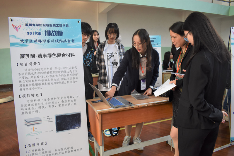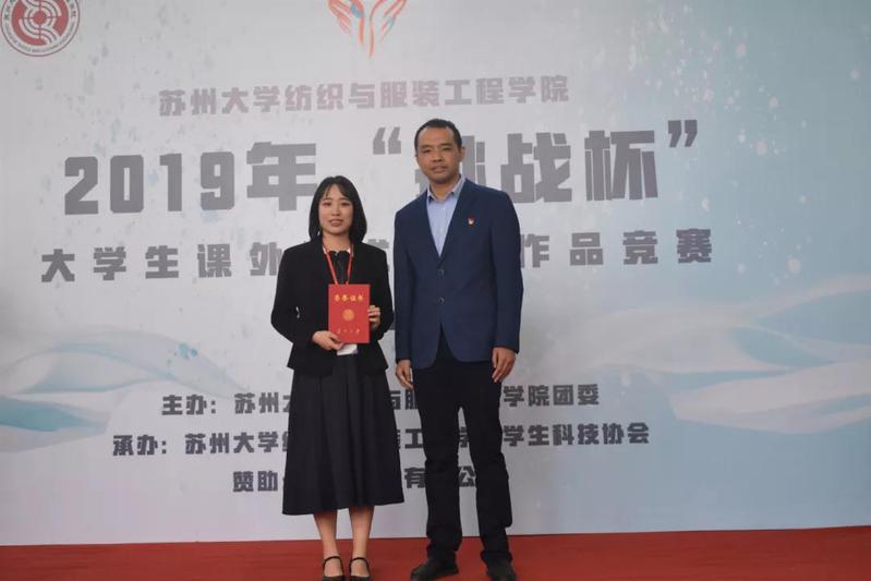 《丝素蛋白的改性与表征》、《中药保健助眠家纺面料研究》等项目获得单项奖,《PBS纳米纤维膜的改性制备及其在染料吸附上的应用》、《新型丝素纳米银的应用基础研究》、《有机硅改善棉纤维蓬松性》获得最佳人气奖。 至此,苏州大学纺织与服装工程学院2019年“挑战杯”大学生课外学术科技作品竞赛圆满结束。本次竞赛不仅是对学院第十三批本科生科研基金项目的成果考核,也是对新一批科研立项的预热。“挑战杯”的成功举办有利于同学们对专业课深入学习,提高同学们的创新创业能力,也代表了学院本科学生科研水平达到了新的高度。