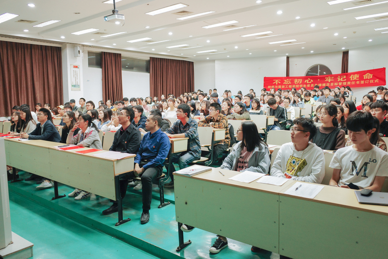 会议开始前,全体学生党员共同观看了王继才同志的先进事迹纪录片《孤岛三十二年》,讲述了优秀模范党员王继才不畏艰险、迎难而上,爱岗敬业、舍家为国无私奉献为祖国守荒岛三十二年的精神与事迹。观看结束后,签订仪式正式开始。党委副书记严明首先为全体学生党员解读了先锋模范目标管理责任书。