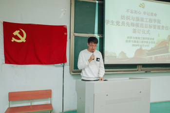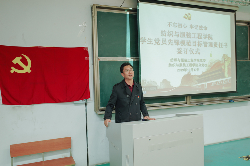 在全党开展“不忘初心、牢记使命”主题教育,是党中央统揽伟大斗争、伟大工程、伟大事业、伟大梦想作出的重大部署。苏州大学纺织与服装工程学院党委根据苏州大学“不忘初心、牢记使命”主题教育领导小组办公室的总体部署,扎实开展“四重四亮”活动,于2019年10月17日18:00整,北校区工科楼407举行了学生党员先锋模范目标管理责任书签订仪式暨分党校开班仪式。学院党委书记董召勤,本科生、研究生各支部书记,全体学生党员出席了此次仪式。仪式由党委副书记严明主持。