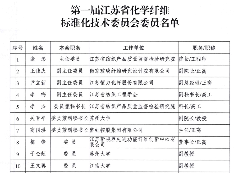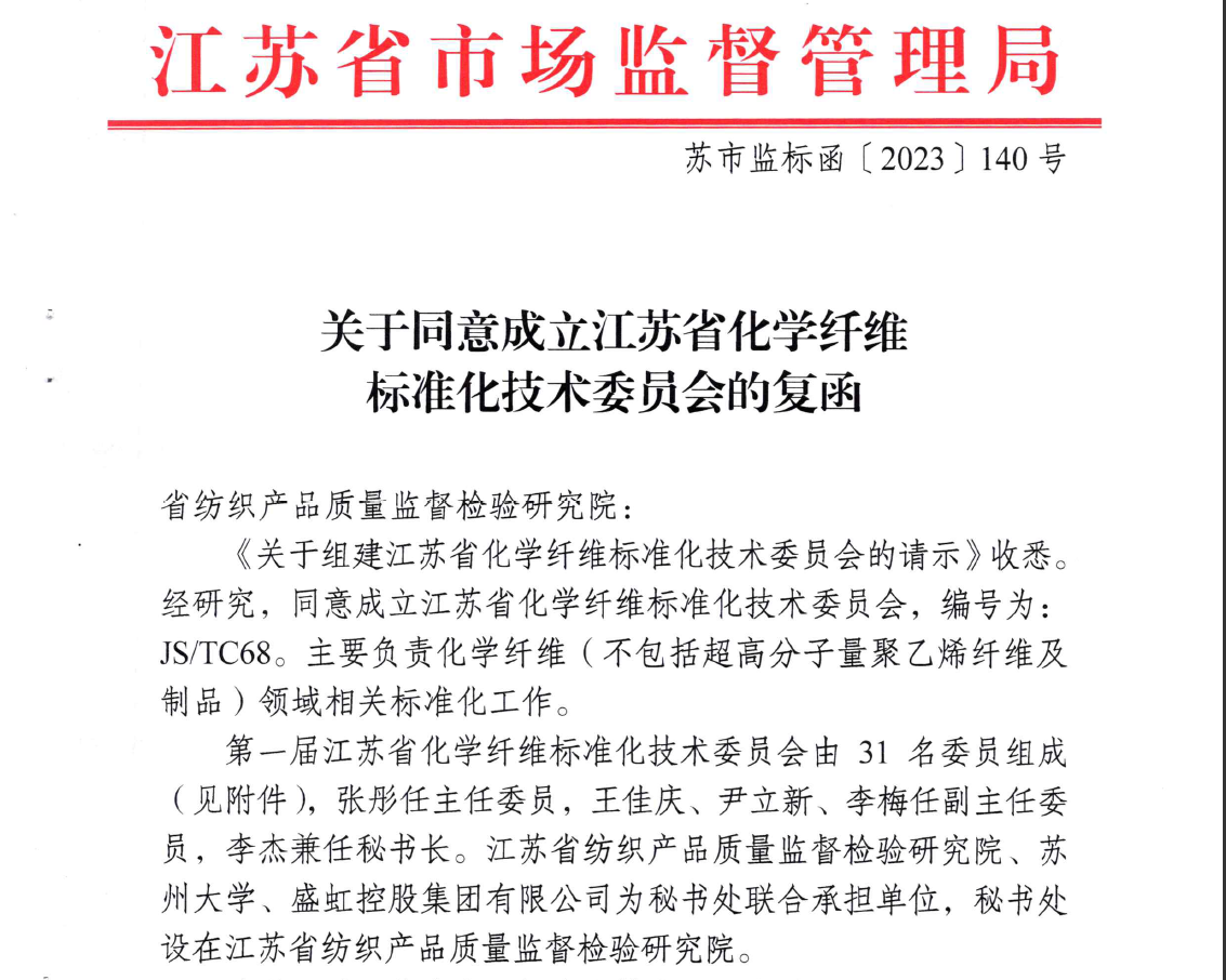 近日,江苏省市场监管发布批复函(苏市监标函[2023]140号),同意成立江苏省化学纤维标准化技术委员会,苏州大学纺织与服装学院积极参与了该委员会的申报工作并获得批准。该标委会由江苏省纺织产品质量监督检验研究院、苏州大学和盛虹控股集团有限公司为技术委员会秘书处联合承担单位。第一届江苏省化学纤维标准化技术委员会由31名化学纤维相关科研、生产、检测等领域方面的专家学者组成,致力于制定关于化学纤维产品、生产、检验和质量控制等方面的标准及技术规范。省纺检院张彤院长担任主任委员,南京玻璃纤维研究设计院有限公司王佳庆副院长、江苏恒力化纤股份有限公司尹立新副总经理和江苏省纺织工程学会李梅副秘书长担任副主任委员,省纺检院李杰高工兼任秘书长。我院关晋平副院长担任委员兼副秘书长,于金超副教授担任委员。