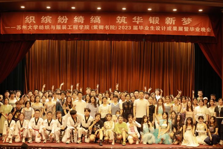 2023年6月11日晚,“织缤纷绮缟·筑华缎新梦”——苏州大学纺织与服装工程学院(紫卿书院)2023届毕业生设计成果展暨毕业晚会在本部敬贤堂圆满落幕。本次活动由学院学生科技协会、学生会、I SHOW模特社、苏酷街舞社、道格跆拳道社联合承办,学院党委书记肖甫青、党委副书记、副院长虞岚、服装设计与工程系主任卢业虎、学工办主任季彦斐、团委书记孙晓旭、辅导员杨洋、李磊出席此次晚会。
