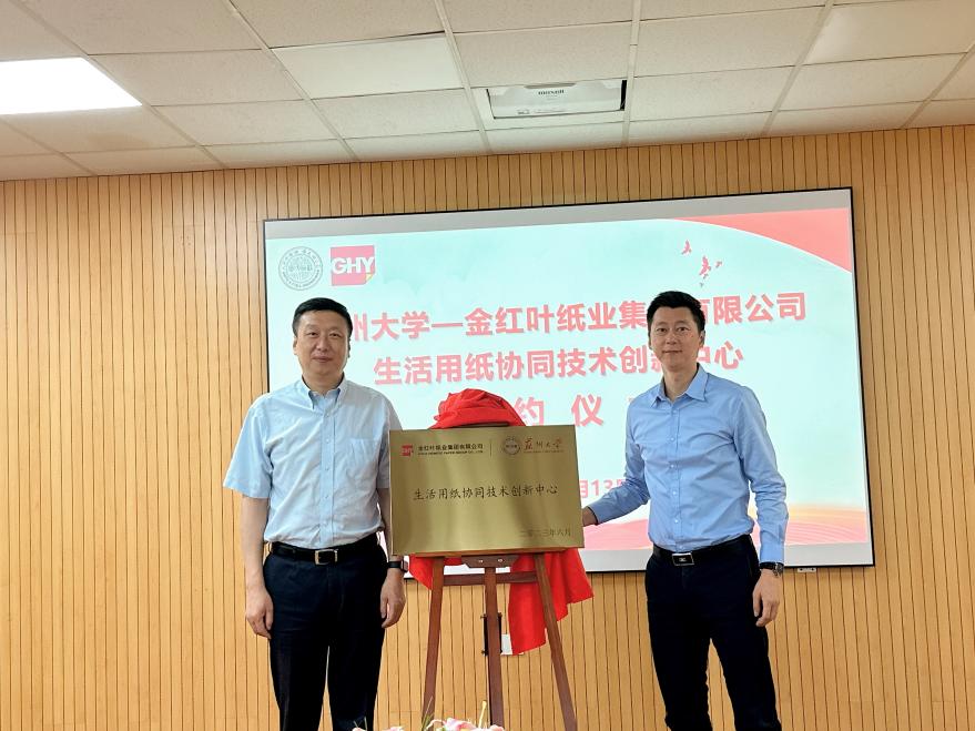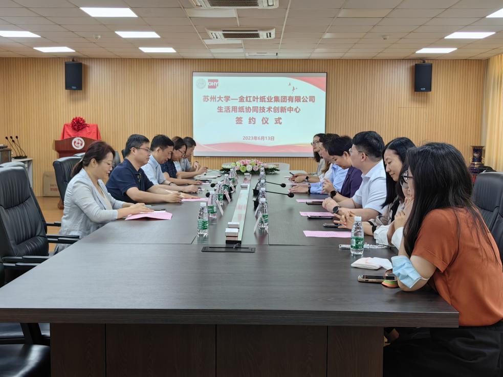 2023年6月13日上午,“金红叶纸业集团有限公司--苏州大学生活用纸协同技术创新中心”签约暨揭牌仪式在苏州大学北校区工科楼422会议室举行。校科学技术研究院院长徐小乐、纺织与服装工程学院党委书记肖甫青、副院长关晋平、孟凯副教授与赵荟菁教授研究团队、金红叶纸业集团有限公司公关总经理王英、研发总监黄锦华等嘉宾出席。仪式由关晋平主持。