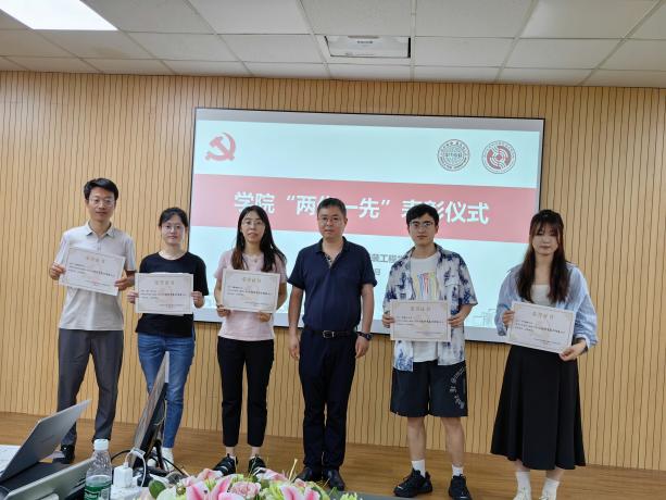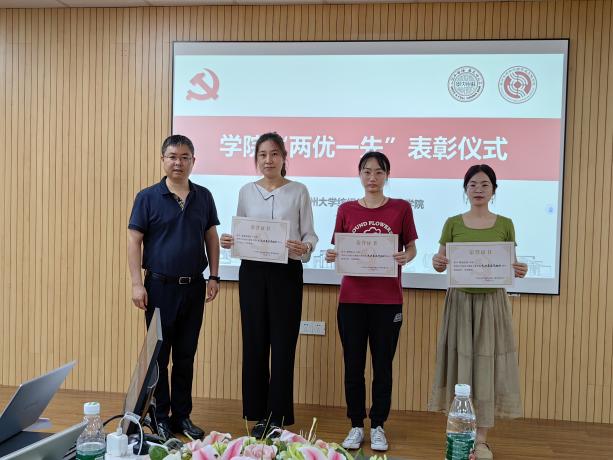 虞岚宣读学院“两优一先”表彰名单和学习强国“学习之星”表彰名单,授予陈廷等27名同志“优秀共产党员”称号,授予关晋平等8名同志“优秀党务工作者”称号,授予本科生社区一支部等3个支部“先进基层党组织”称号。肖甫青为受表彰个人和集体颁发奖状和奖品。