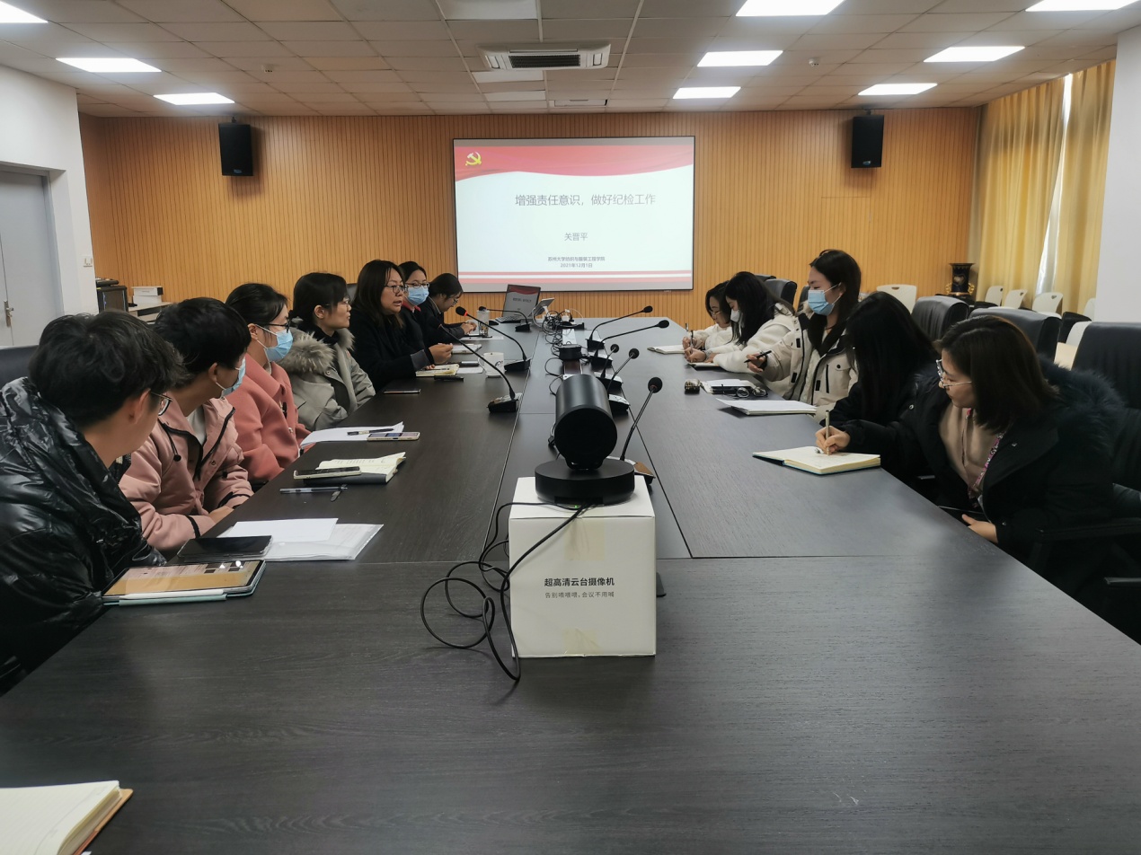 2021年12月1日下午,纺织与服装工程学院在北校区工科楼422会议室召开纪检工作专题培训,会议主题是《增强责任意识,做好纪检工作》,全体党支部纪检委员出席,会议由学院党委纪检委员、副院长关晋平主持。