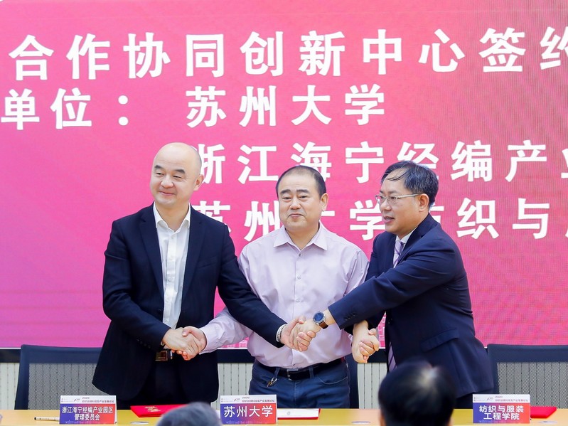 随后,学校与浙江海宁经编产业园区管理委员会、浙江华祥福医用器材有限公司、湖州南太湖时尚创意城投资发展有限公司三家单位,签约成立校企合作协同创新中心。协同创新中心的建立将结合学院和企业的优势,推进相关领域的教学和研究工作,加速科研成果的产业化,为我院学生创新、创业、实习提供新的平台。